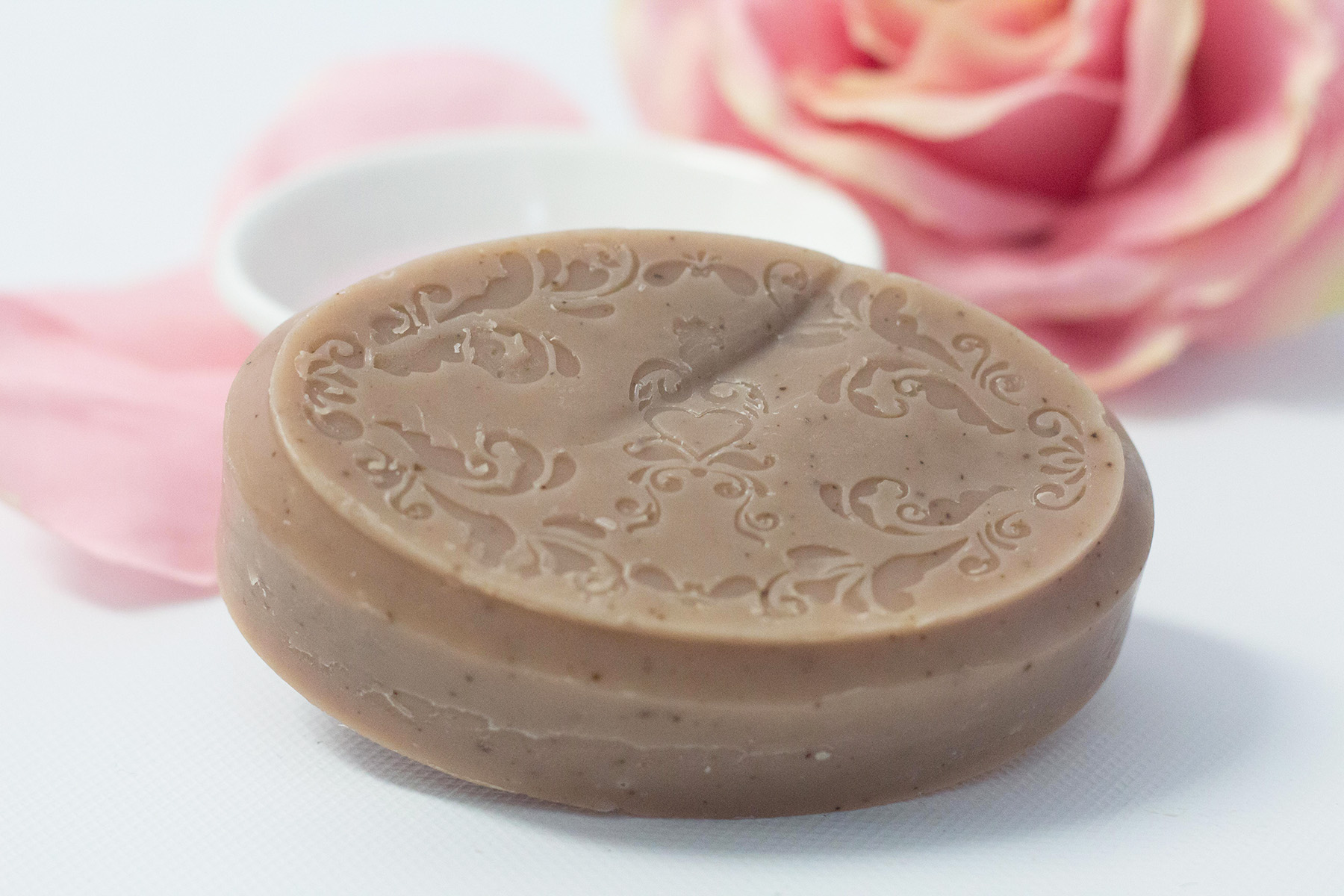 Ingredients: Olive oil, Coconut oil, Castor Oil, Cocoa butter, Red Moroccan Clay, Dried and Powdered Rose Petals, Rose-infused Olive Oil, Rose Essential Oil